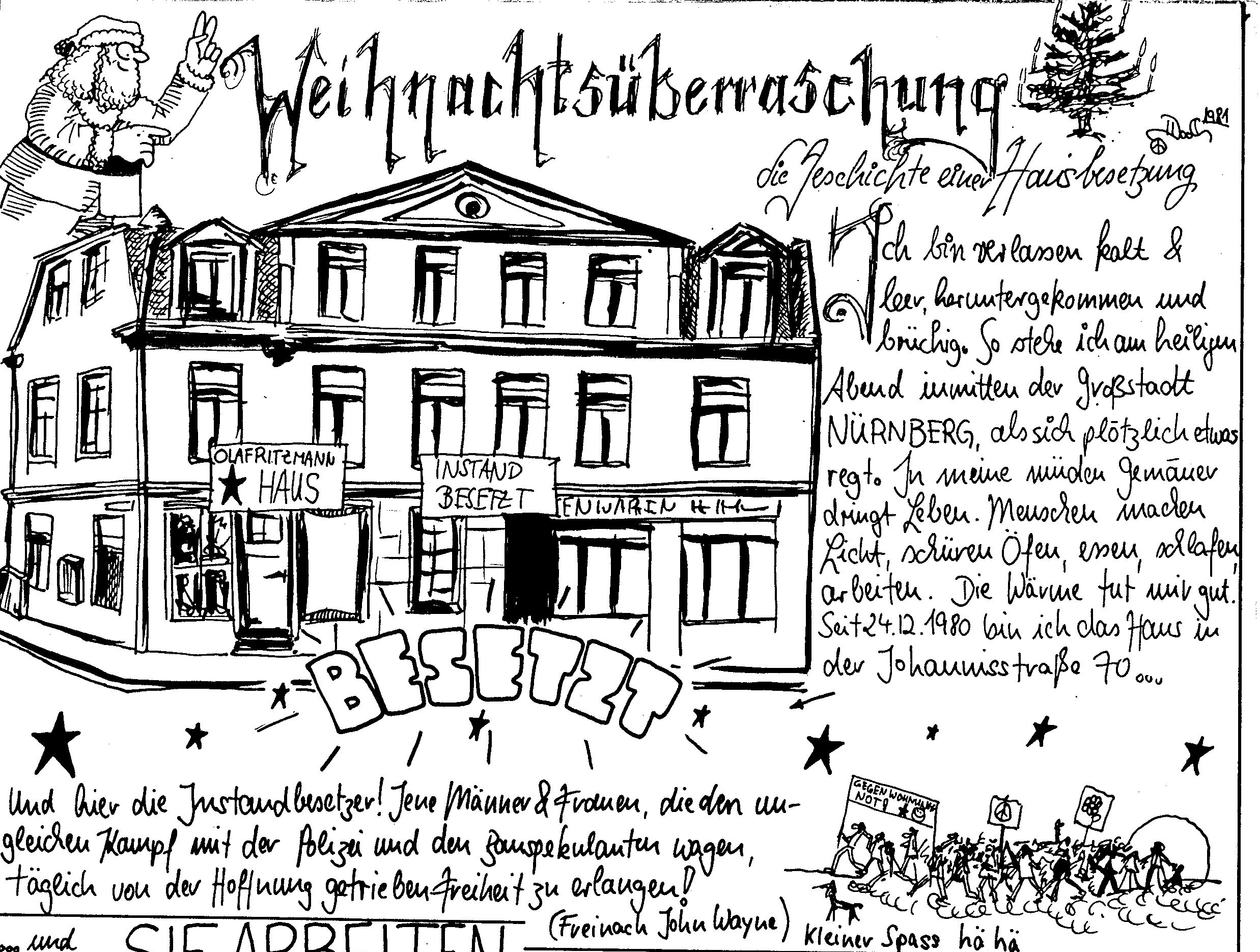 Das 1-stündige Feature der Redaktion Zwischenfälle bei Radio Z berichtet über die Hausbesetzungsbewegung der 1980er Jahre. Schwerpunkt sind die Ereignisse in Nürnberg. Beleuchtet werden die zeitgeschichtlichen Hintergründe. Akteure und Akteurinnen von damals kommen zu Wort.